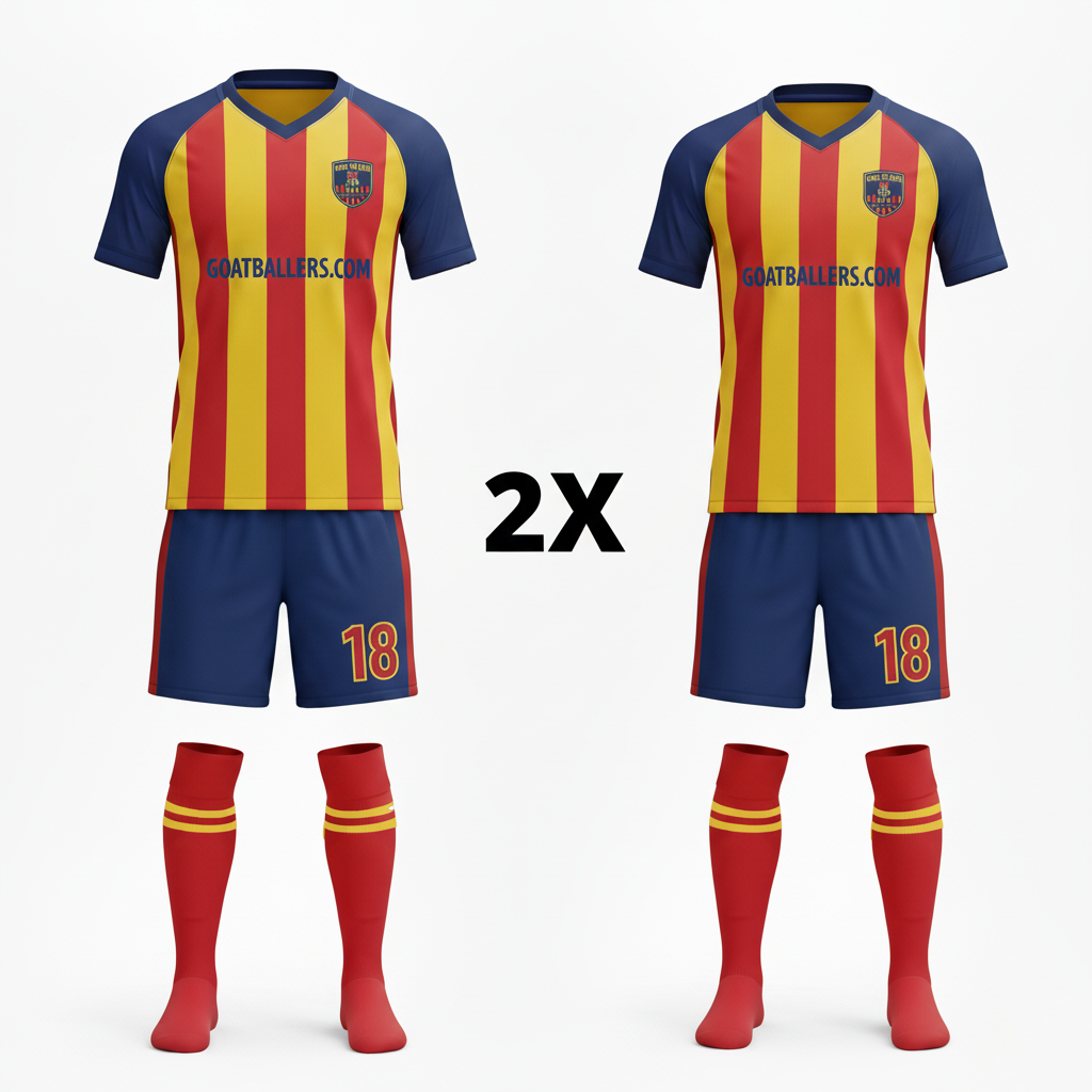 The Jersey: Our eye-catching jersey features a dynamic red and yellow vertical stripe design, ensuring your team makes a bold statement on the field. The contrasting blue sleeves with subtle red and yellow accents add a touch of modern flair. With the distinctive GOATBALLERS crest, this jersey embodies team spirit and aspiration. Crafted for breathability and freedom of movement, it allows players to stay cool and agile through every pass, dribble, and shot.